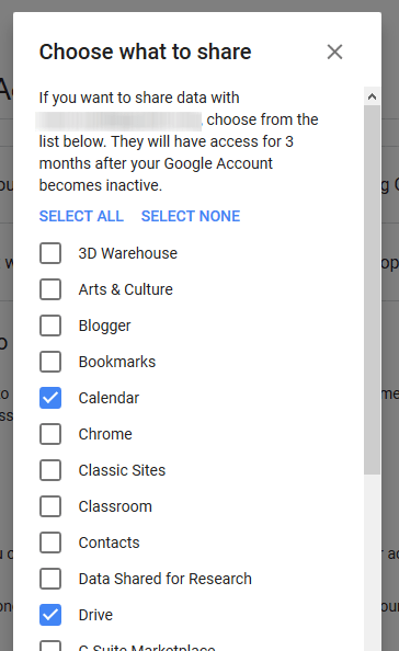 After adding someone, you then need to choose which Google accounts of yours you want to share with them. There’s a big list so just tick the ones you feel have relevant information you want them to have.