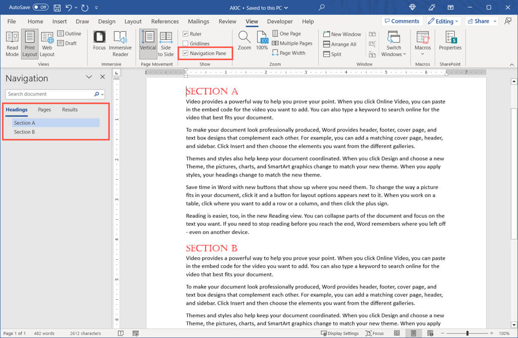 In addition, you can jump to a particular heading easily using the Navigation Pane. Go to the View tab and check the box for Navigation Pane in the Show section.