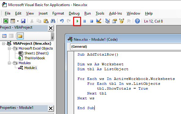 This code can also turn off the Total row, but you’ll have to change the “tbl.ShowTotals = True” code line into “tbl.ShowTotals = False.”