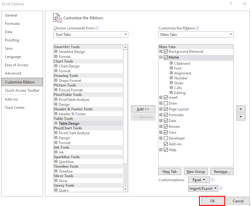 - An Excel Options pop-up window will appear. Select Customize Ribbon from the left side menu.