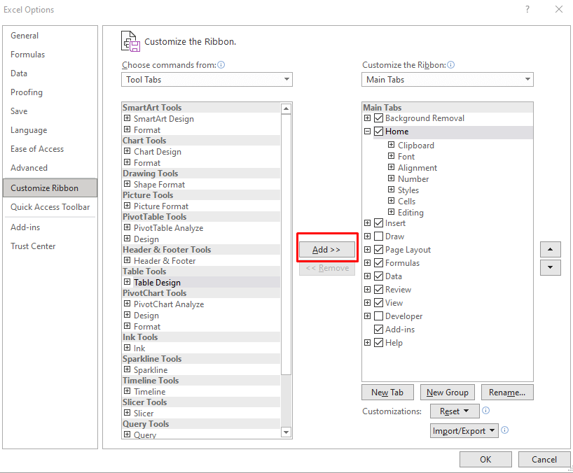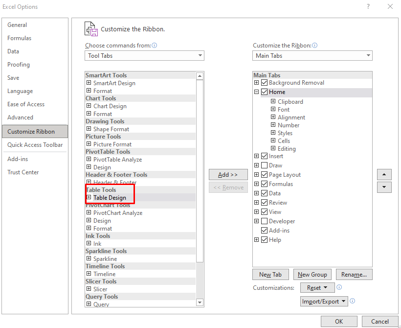 - Click the Add button in the middle to add Table Designs to the ribbon.