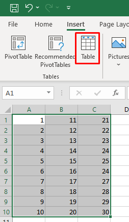 - Select the icon named Table.
