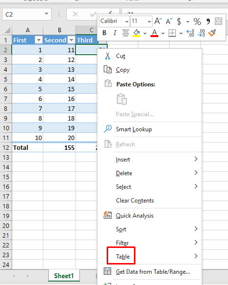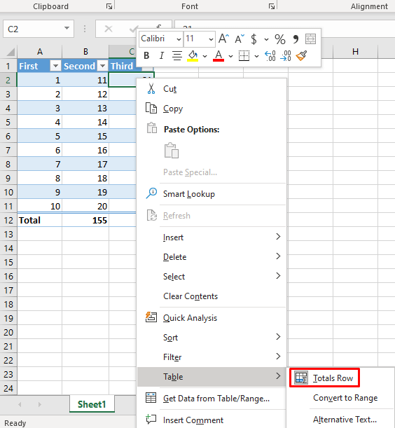 Another way of adding a Total row is from the right-click menu. Many Excel users will find this to be the simplest method.