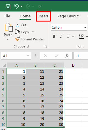 - Go to the Insert tab on the Excel ribbon and click it. It should be located right in between the Home tab and Page Layout tab.