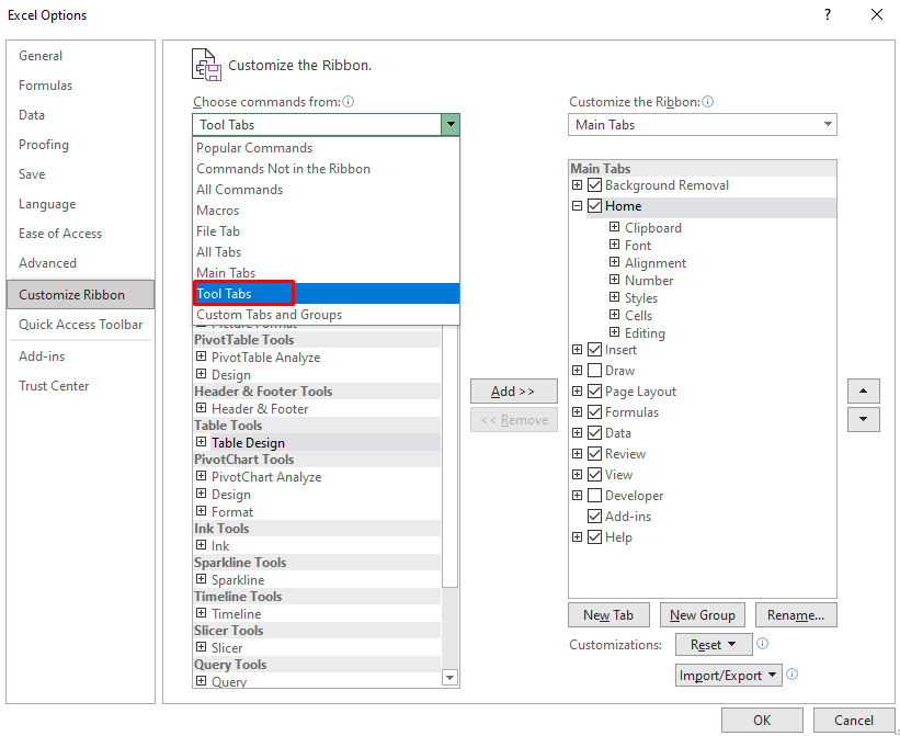 - Click on the Choose commands from the section to open a drop-down menu, then select Tool Tabs.