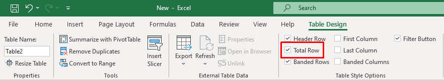 Once you check the Total Row in the Table Design tab, your Excel table will automatically add a new row at the bottom where a total number will be displayed in bold.