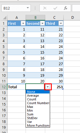 Another handy keyboard shortcut will allow you to select different aggregation types in your table. You can switch between Excel formulas easily. Press Alt + Down arrow to activate the cell’s drop-down menu to select an aggregate. You can continue using the Up and Down arrows to navigate the drop-down list. In order to select the wanted aggregation and apply it to the table, press Enter on your keyboard.