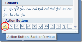 Go back to the Shapes button on the Insert menu and once again locate the Action Buttons section at the bottom of the menu. This time, select the button with the arrow pointing to the left.