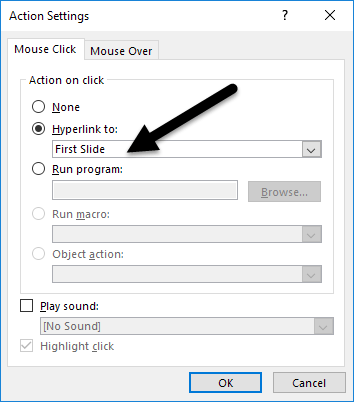 Notice that on the Mouse Click tab, the Hyperlink To option is already checked and the First Slide link is already chosen in the drop down menu.