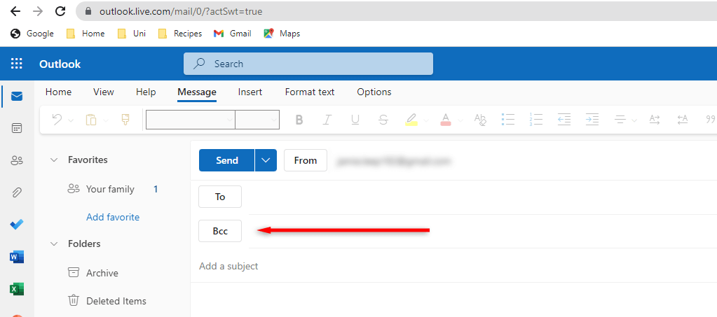 - This will open the BCC line. Type in the email address of the person you wish to BCC, or choose them from your address book. Write your email and press send.