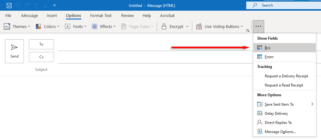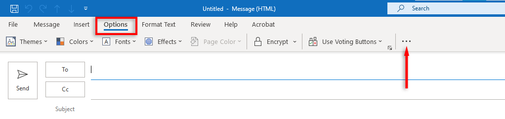 - In the new message window, navigate from the home tab to the Options tab. * Press the three dots on the right-hand side to open the drop-down menu.