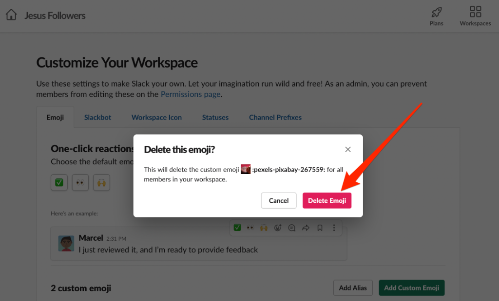 Note: Only workspace owners and admins can delete custom Slack emojis. Members can only delete the custom emoji they add to the workspace.