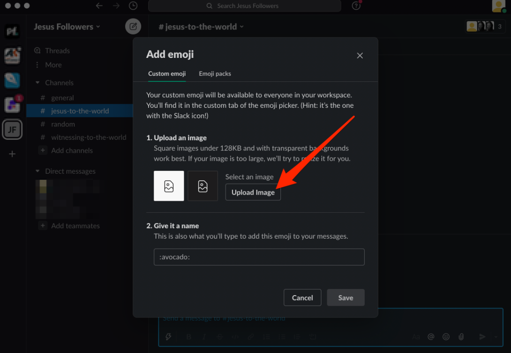 - Select **Upload Image** and choose the image file you want to add as a custom emoji.