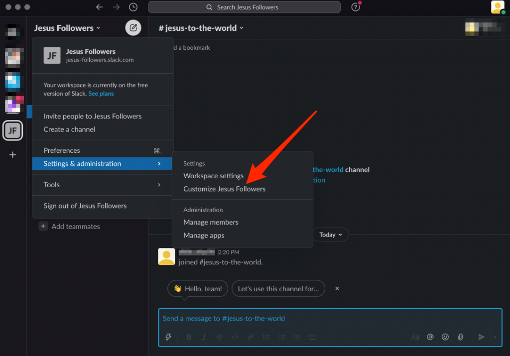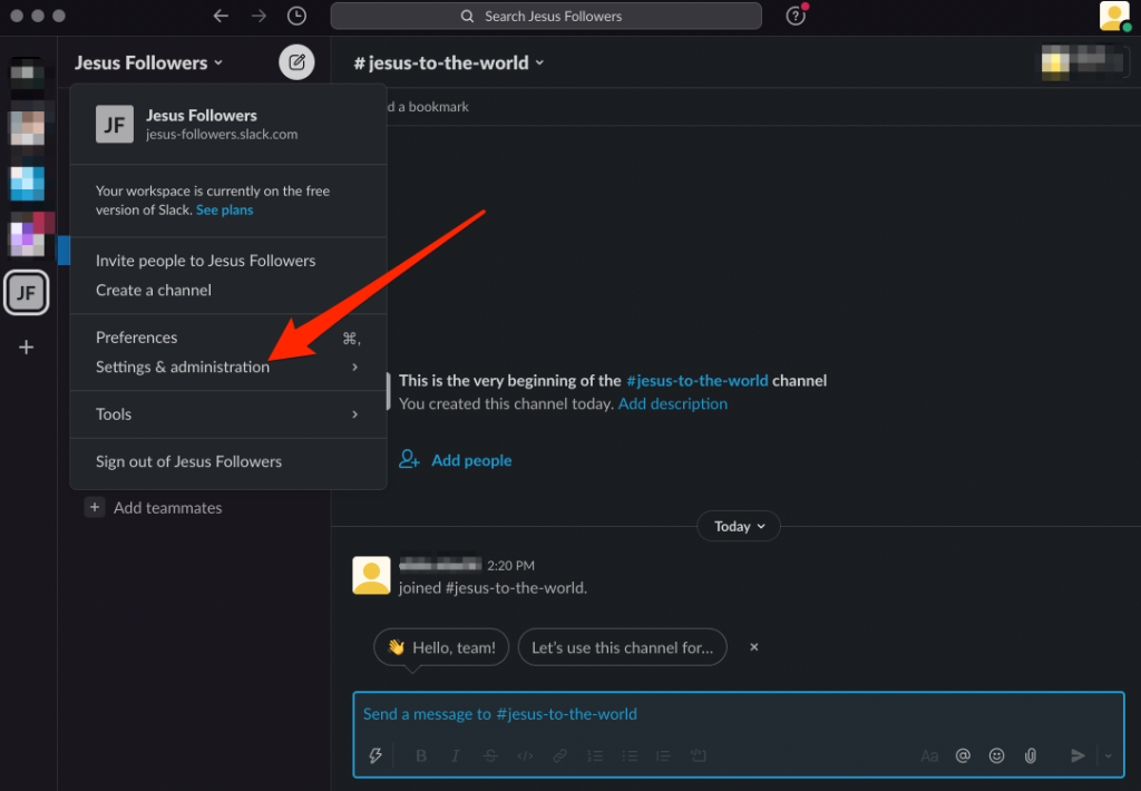- Open your Slack workspace and select the workspace name from the upper left side of your screen.