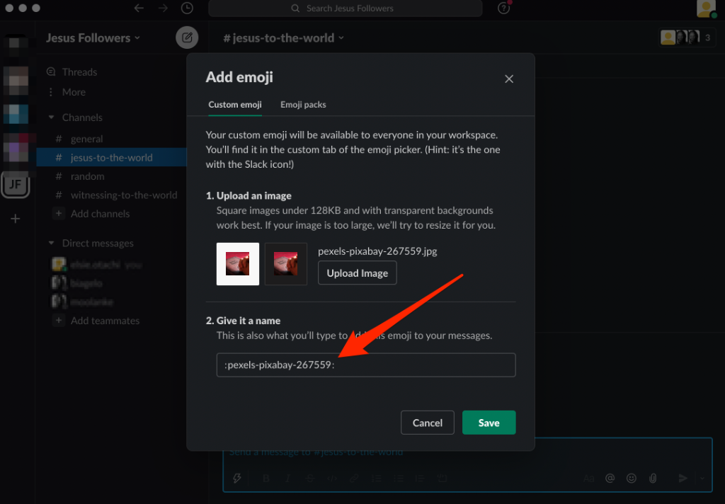 - Type a name you can remember for your emoji under the **Give it a name** section. This way, it’ll be easier to select your emoji by typing **:emojiname:**. Slack uses colons before and after the name to signify an emoji.