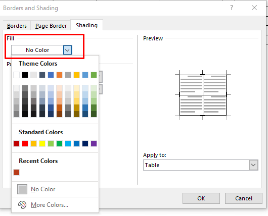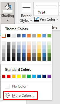 - Go to the Shading drop-down arrow again, and select More Colors at the end of the drop-down menu.