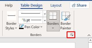 - If you’re using the latest version of Microsoft Office, to find this option go to Table Design, and then click on the arrow pointing down in the bottom right corner of the Borders section.
