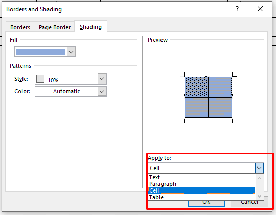 - You can also go to the Apply to drop-down menu and choose Cell to apply the coloring only to the table selection. If you choose Table, the color will be added to the entire table.