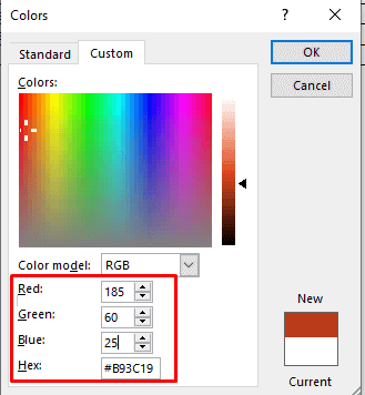 - Click anywhere on the color panel to select a custom color, or enter your custom RGB color code in the appropriate fields.