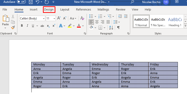 - Select the table you want to add color to and go to Table Design.