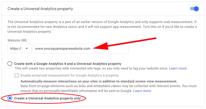 - Activate the toggle switch to **Create a Universal Analytics property**.