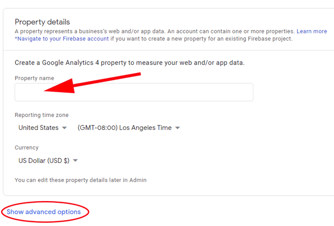 - Type in a **Property Name** (e.g., the name of your website or the website’s URL) and select **Show Advanced Options**.