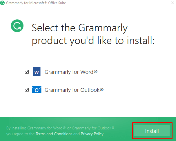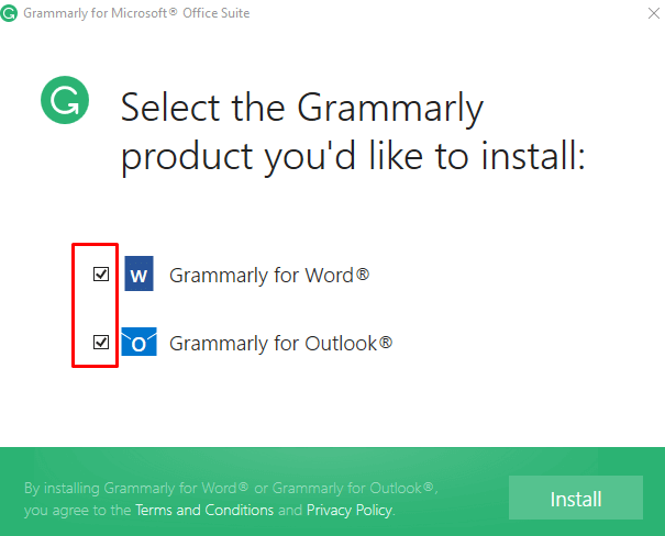 - Check the boxes next to Grammarly for Word, and if you want Grammarly for Outlook.