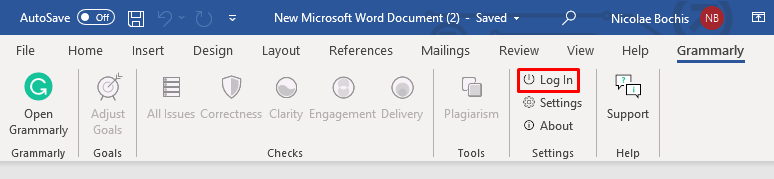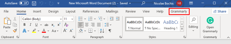 - Go back to MS Word and select the Open Grammarly action tab in the toolbar. It has a big green Grammarly logo on it.