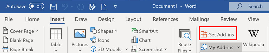 - Within Insert, select Get Add-ins. This will take you to the Microsoft AppSource website.