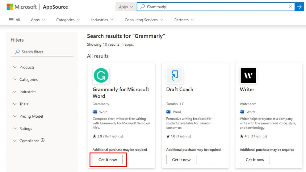 - Select Grammarly for Word from the list of search results, and click the Get it now button.