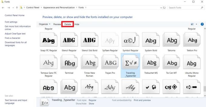 - On the bar above the fonts, find and click the **Delete **button.