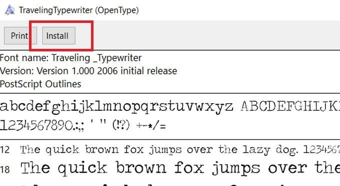 - A window will open showing examples of your font. At the top left, click on the **Install **button.