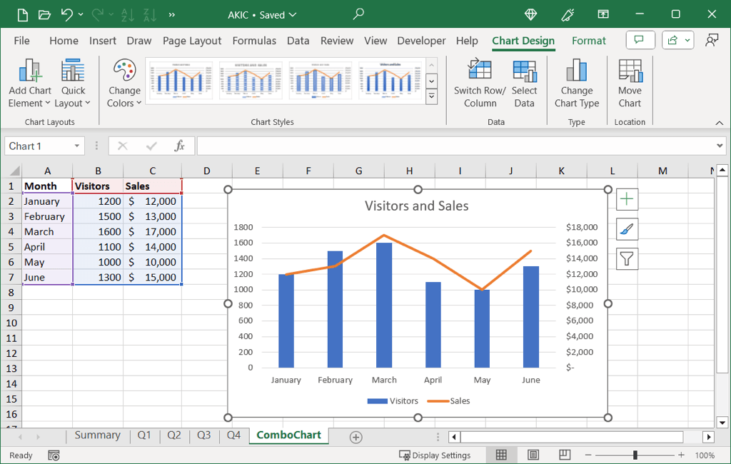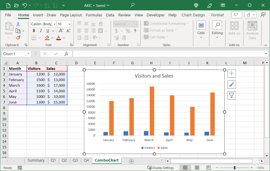 For instance, you can see that the column chart below doesn’t accurately depict the visitors and sales in our dataset. There’s a large variance in the sales amounts, making it hard to get a decent picture of the number of visitors per month. Plus, the sales are in dollar amounts, whereas the visitors are basic number values.