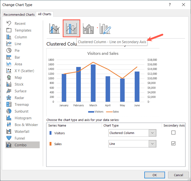 - On the right side, pick the chart at the top that uses the “Line on Secondary Axis” as shown below.