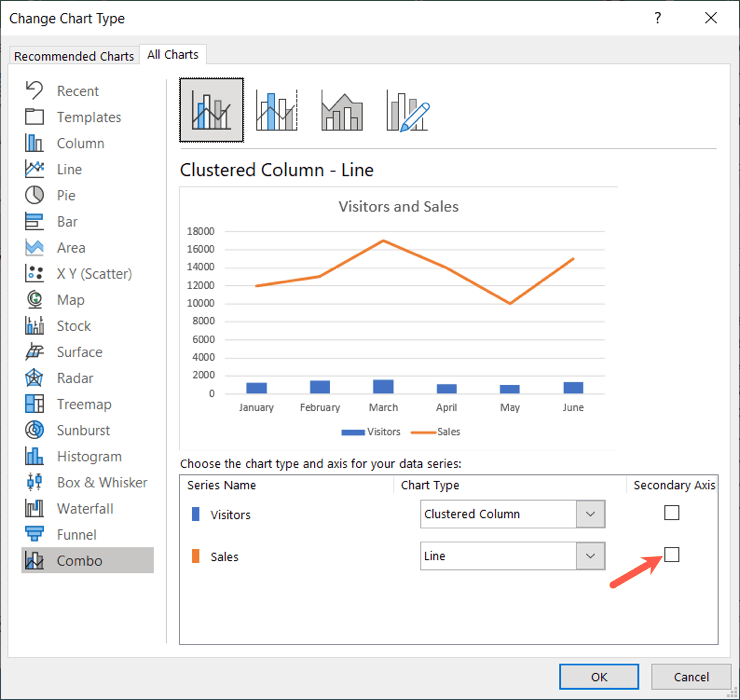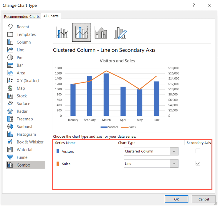 - Use the drop-down boxes at the bottom to customize the types of charts for each series or the checkboxes to change which series displays as the Secondary Axis.