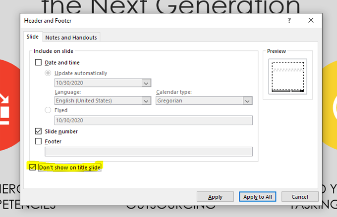 - Check the box next to **Slide Number**. Make sure there’s a checkmark in the box next to Slide Number.