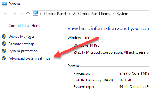 On the System dialog page, you’ll see an Advanced system settings link on the left-hand side.