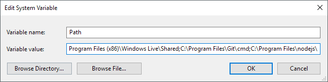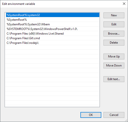 On the Edit environment variable dialog, you’ll see a list of all the paths that are currently in the PATH variable. As you can see, Node.js and Git already added their paths so that I can run Git commands and Node.js commands from anywhere while in the command prompt.