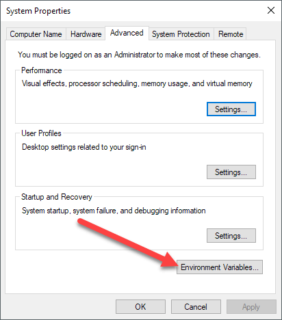 This will bring up the System Properties dialog, which should already be open to the Advanced tab. Go ahead and click on the Environment Variables button at the very bottom.