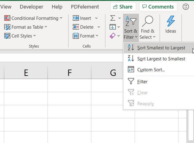 Select the Home menu, and select the Sort & Filter dropdown in the Editing group on the ribbon.