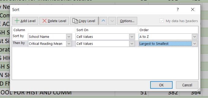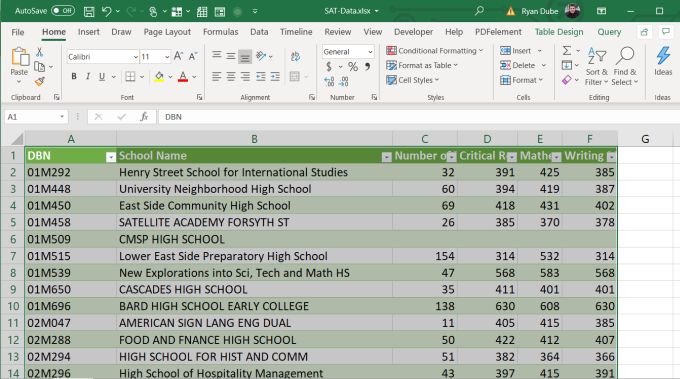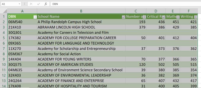 To see how this works, let’s take a much larger spreadsheet as an example. The spreadsheet in this example is a list of SAT scores for high schools in the state of New York.