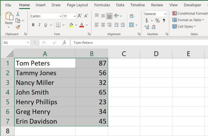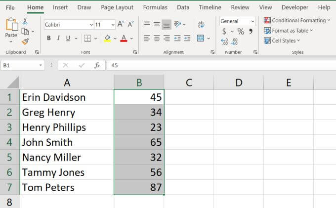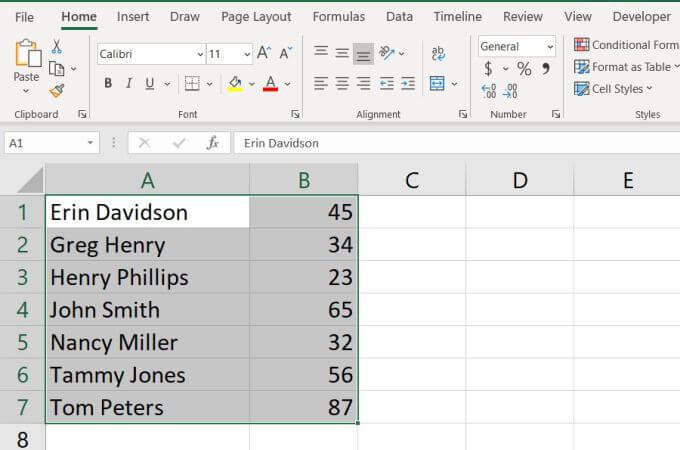 Now, you’ll see that not only have the names been sorted alphabetically in your Excel spreadsheet, but the associated ages from the second column sorted along with them. Those ages stayed with the correct name.