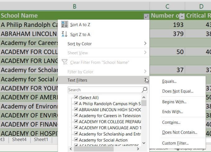 The other filtering options at the bottom won’t help you to alphabetize in Excel, but there are lots of options to filter out data you don’t care about. When you select Text Filters, you can choose to only display data in the sheet that: