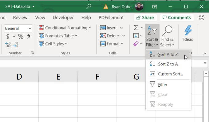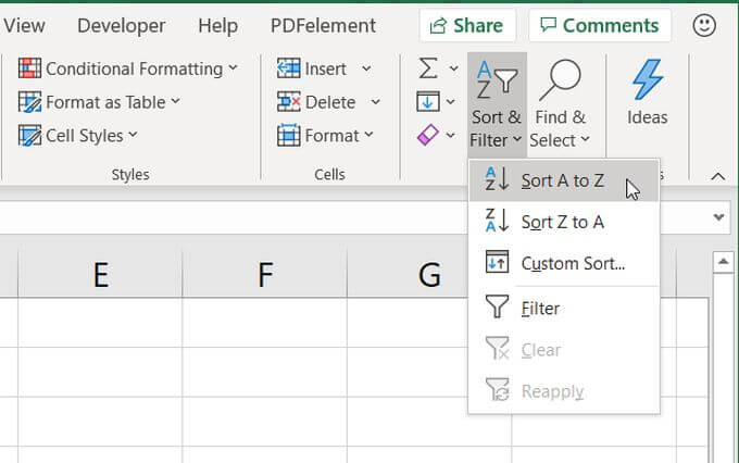 This time, when you select Sort & Filter on the ribbon, you’ll see that the selections for how to sort have changed.