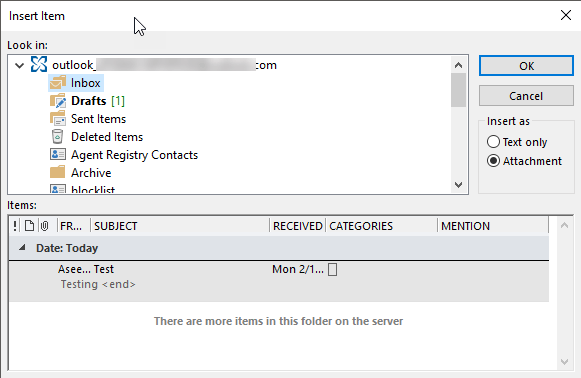 You can choose from Business Card, Calendar or Outlook Item. Click on Outlook Item and you’ll get another screen where you can choose ANYTHING from Outlook itself including a calendar event, contact card, any email messages, tasks, etc.