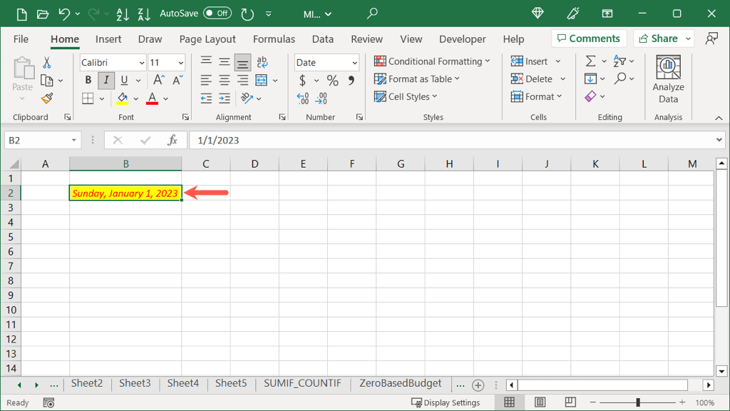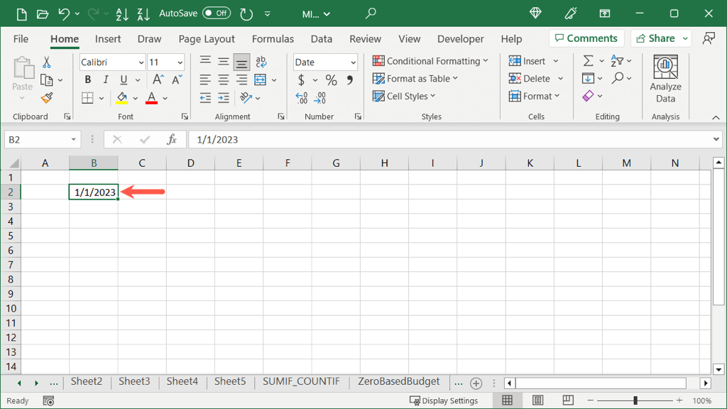 - Enter a date in a cell using your preferred format and select the cell.