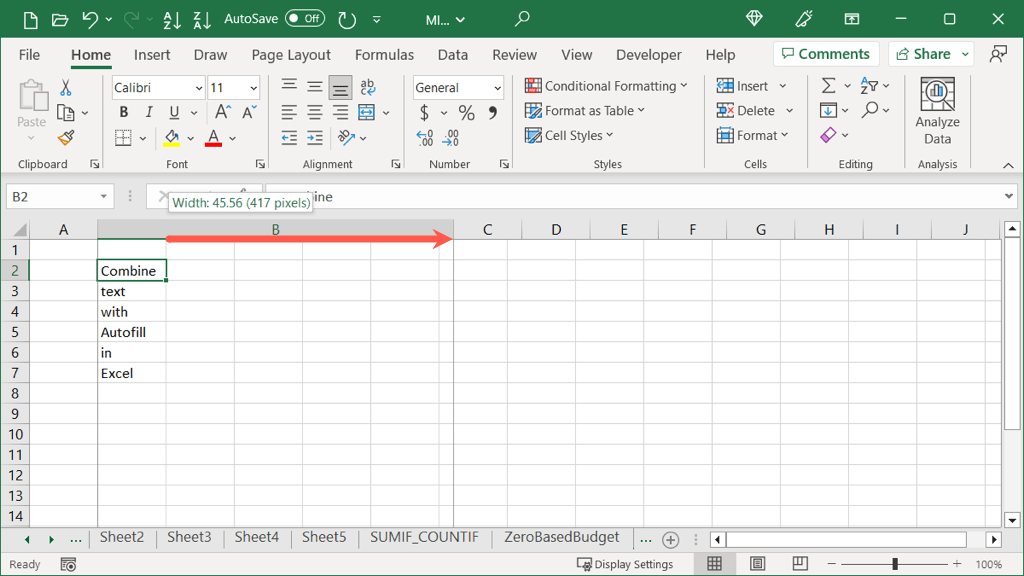 - Start by increasing the width of the column that will contain the combined text. You can simply select the column header and drag the arrow that appears on the right to increase the width. If you skip this step, the result won’t be accurate.