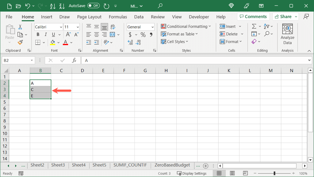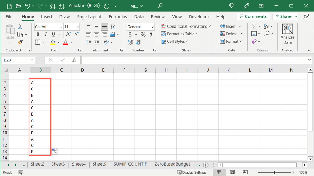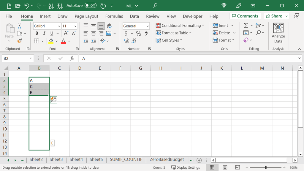 For a basic example, we have letters A, C, and E. We want to fill the remaining cells with the same letters in that order.
