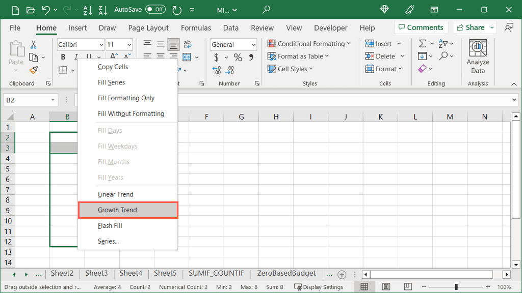 - Hold your right mouse button as you drag the Fill Handle in the direction you want to fill. * When you reach the number of cells you want to fill, release and you’ll see that pop-up window but with additional options available. * Select Linear Trend.