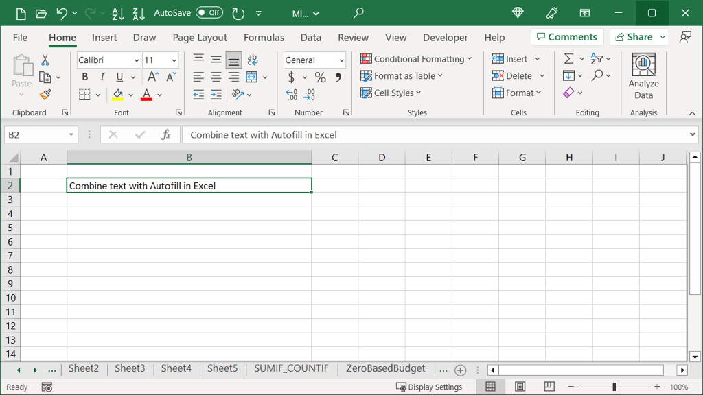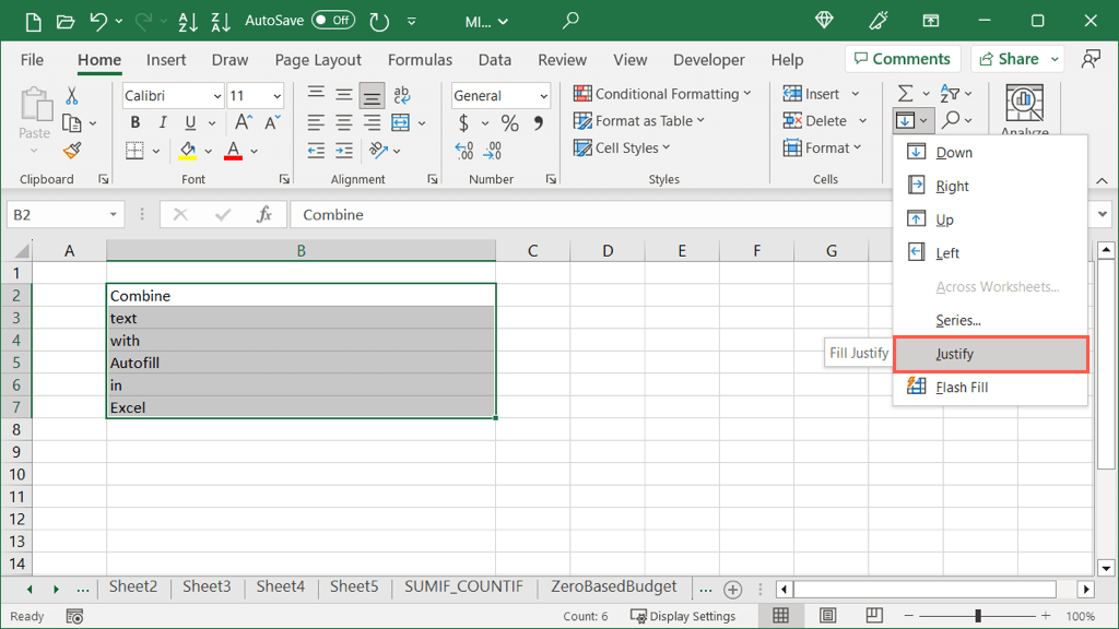 - Go to the Home tab, open the Autofill drop-down menu, and choose Justify.